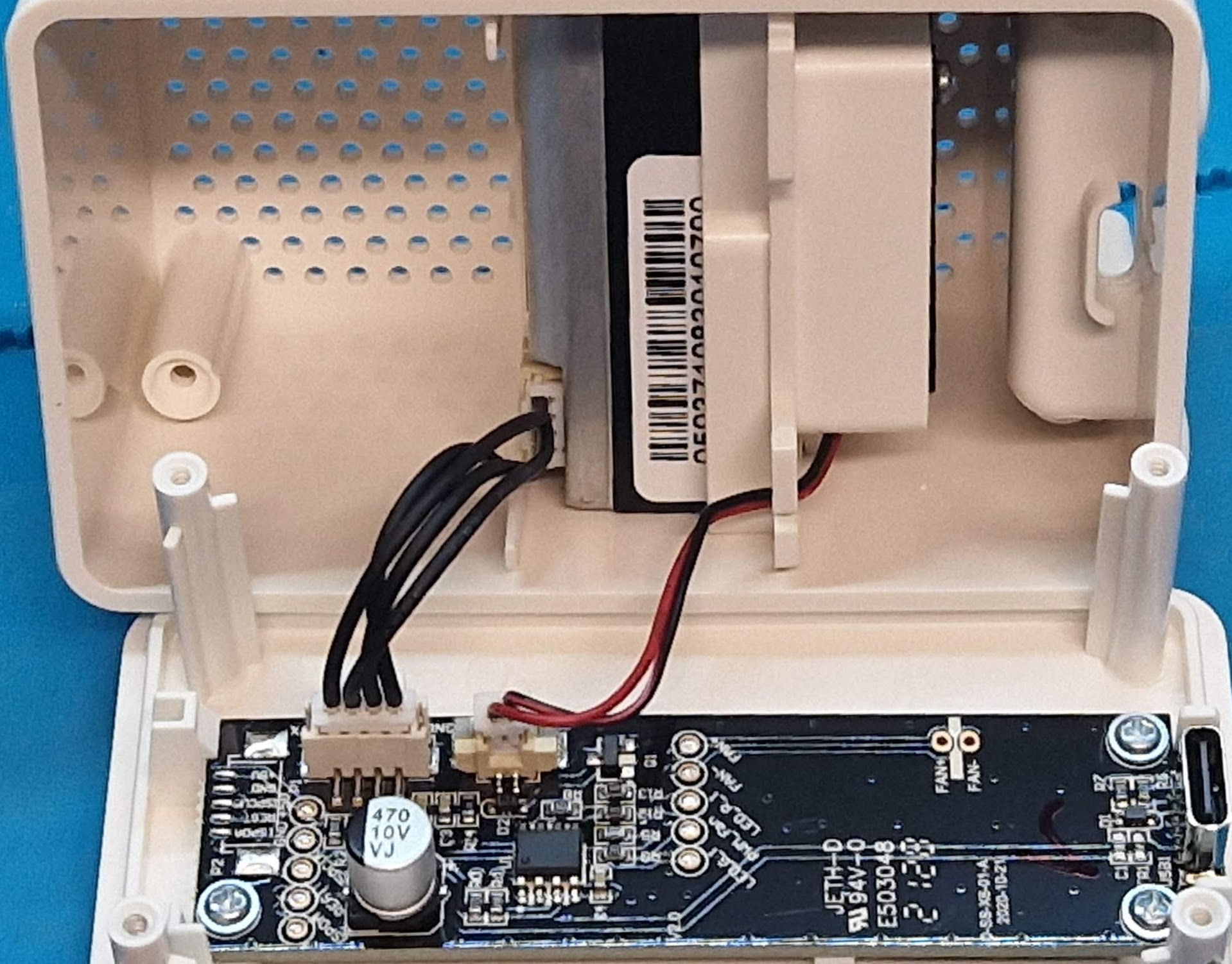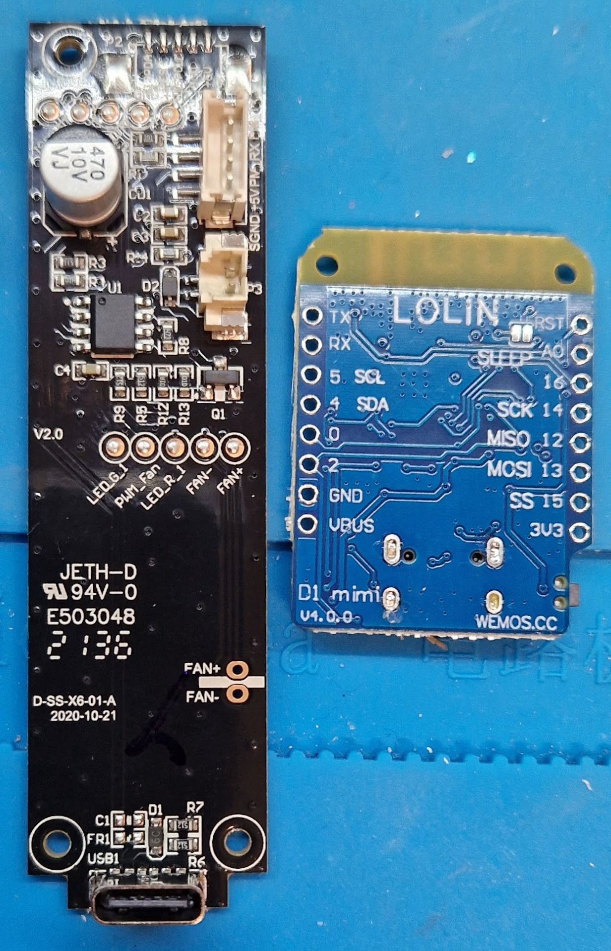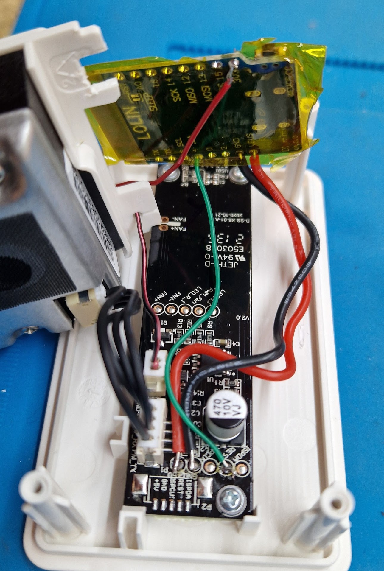 A common hack is to cut the +5V of the fan and solder it to the +3.3V of the WeMos D1 Mini ESP8266, this indeed works pretty well and the device becomes finally quite. But there’s a catch, is it still as reliable?