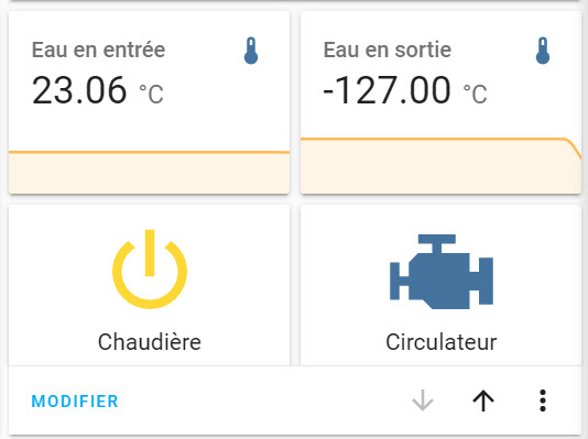La configuration consiste à créer 2 capteurs de température et 2 interrupteurs grâce à la plateforme MQTT puis à les ajouter à l’écran général.