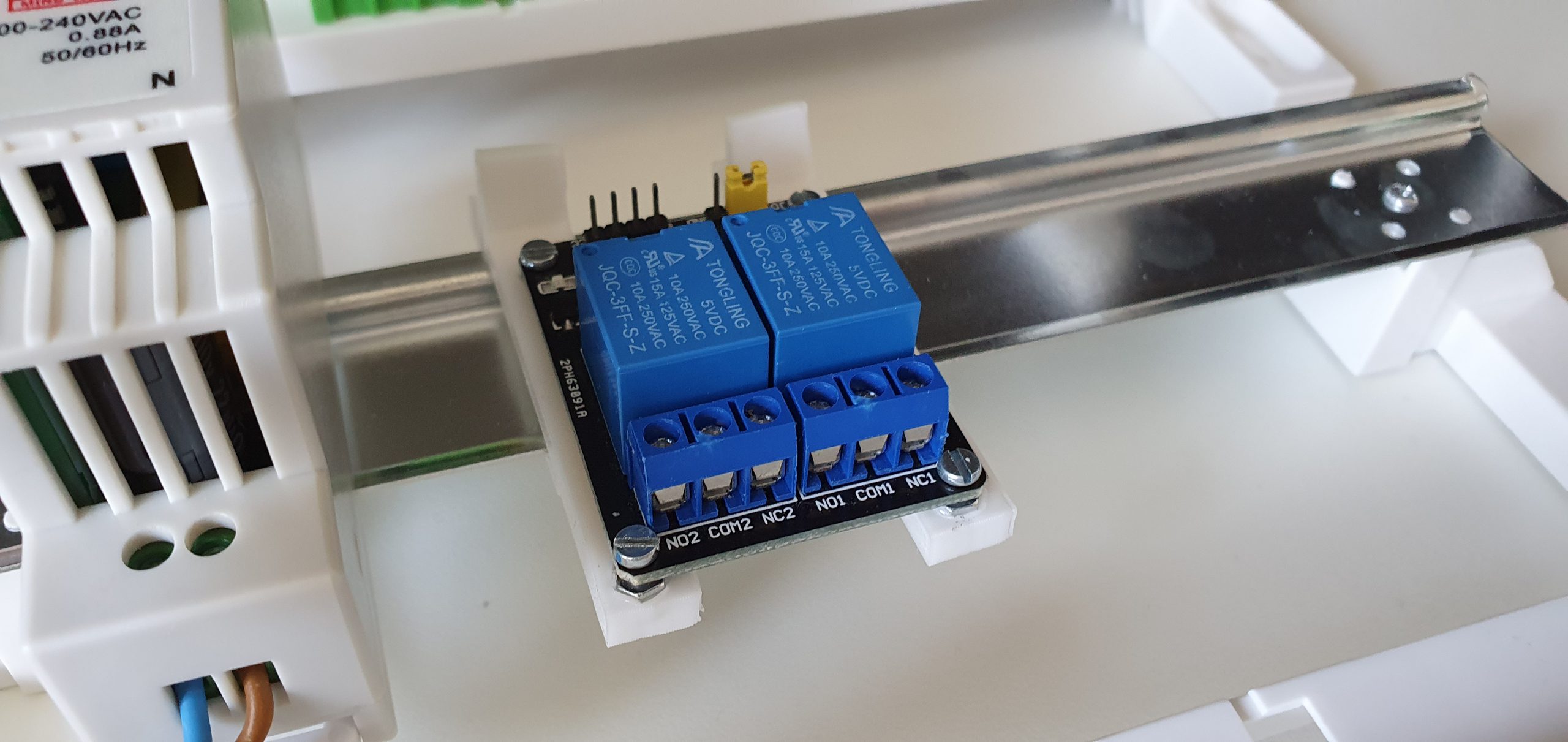 - Un transformateur au format rail DIN : Avec 3A et 5W, c’est idéal pour alimenter facilement le tout. Bonus, avec une LED intégrée, on voit d’un coup d’œil si le tout est sous tension;